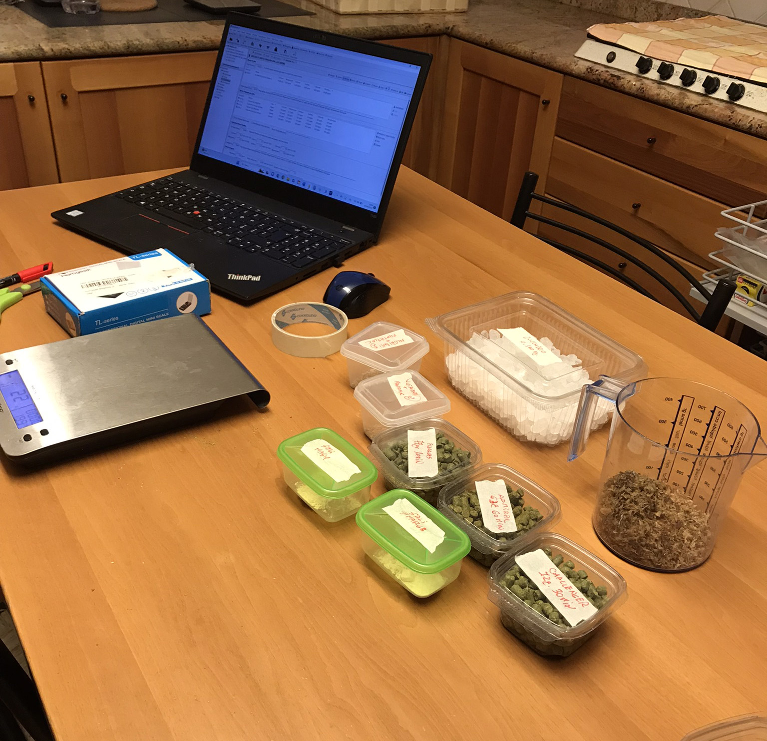Io dormo al piano primo, dove ho anche il frigorifero della cucina, e dove tengo Luppoli e lieviti, e dove solitamente ripongo tutti gli ingredienti aggiuntivi (sali, additivi, luppoli) predisposti nelle giuste quantità la sera precedente. Quindi porto con me in garage, il PC da dove gestisco con beersmith le ricette, un Echo Dot di Alexa con cui imposto i timer e ascolto musica, gli ingredienti predisposti, Sanificante, Detergente e Acidificante (mix di Acidi per la correzione del PH e Acido Citrico).