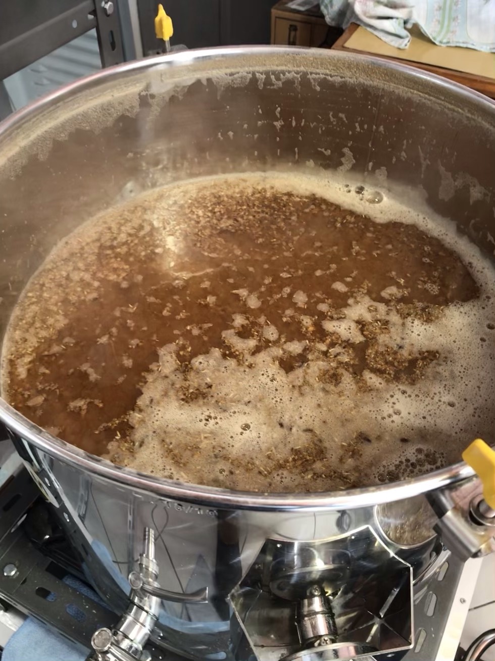 Il punto di MASH OUT non è basilare di per se – sempre 78° sono da raggiungere – ma è importante rispetto al fatto di avere o meno raggiunto la massima estrazione di zuccheri possibile. Infatti la determinazione del MASH OUT delegata al test dello iodio è basilare nel momento in cui il mash è ai minimi essenziali di tempo, ma, come nel mio caso in quest’ultimo anno (2022-23), dove i tempi di MASH si sono prolungati a 120-180 minuti, il MASH OUT è più una decisione che una azione indotta; tanto è che ho smesso di fare il test dello iodio, tendenzialmente inutile a mio parere dopo 180min di MASH. Viceversa la temperatura è importante. Infatti non è possibile raggiungere temperature troppo elevate per evitare poi conseguenze di astringenza nella Birra finita, ma è anche vero che l’allungamento dei tempi di FLY SPARGE e di FILTERING abbassano abbastanza la temperatura del letto di trebbie, cosa che si deve bilanciare con una buona temperatura dell’acqua di SPARGE, ma anche cercando di mantenere una temperatura di MASH OUT tra i 78° e gli 80-81°, non oltre ma nemmeno meno. Al momento del MASH OUT tolgo l’agitatore e lascio a riposo le trebbie perché si assestino sul fondo e si formi il classico letto filtrante, e metto il coperchio alla pentola di MASH per mantenere la temperatura il più elevata possibile – chiaro che una buona coibentazione della pentola e la sua capacità di mantenere la temperatura nel tempo è fondamentale.